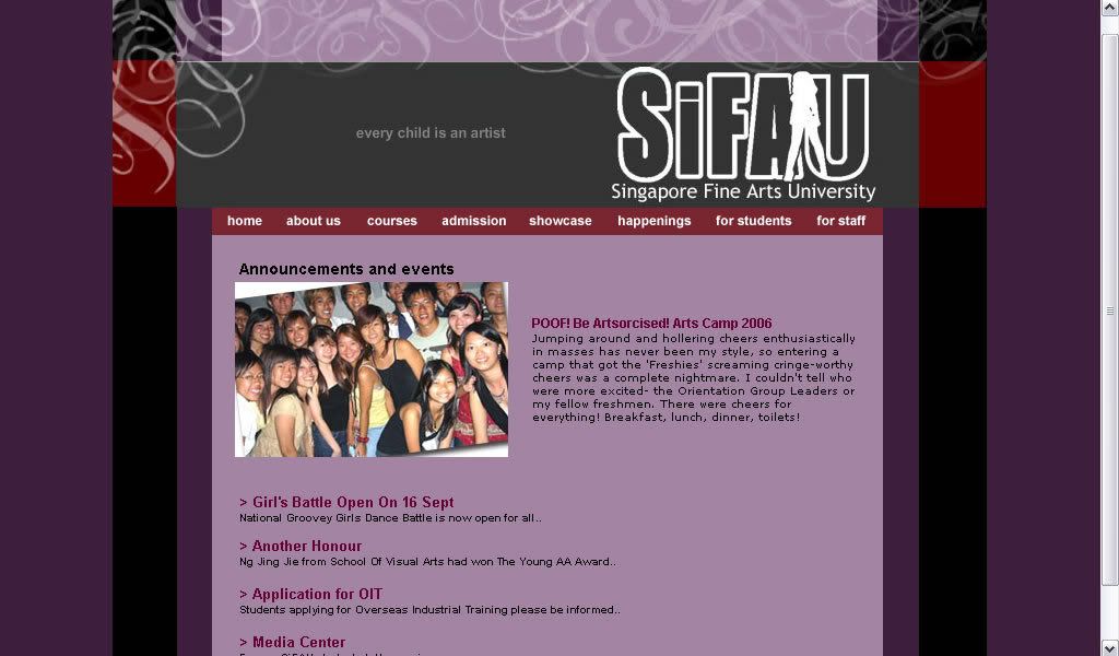 [UED] A website done for a University catered to arts students. This was a group work though. I came up with the logo and played around with photoshop brushes for the website design.